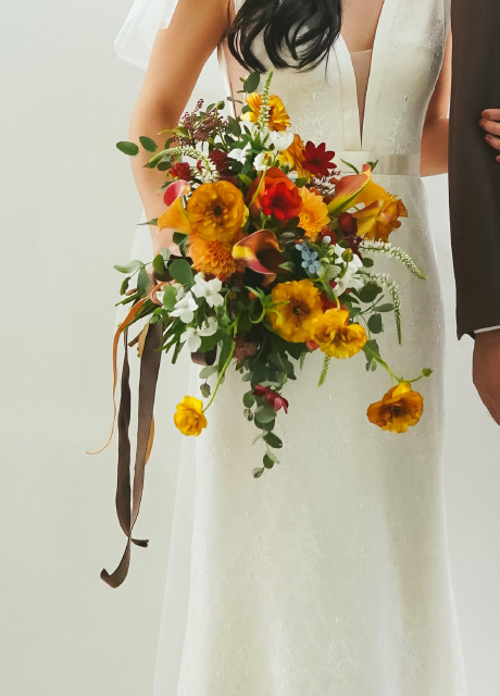 (補足)こちらの花嫁さまは秋に海外挙式を挙げられ、日本で後撮りをされました。12月のクリスマスシーズンに秋をイメージしたブーケというご希望でしたので、お色目を忠実に季節のお花でお作りいたしました。