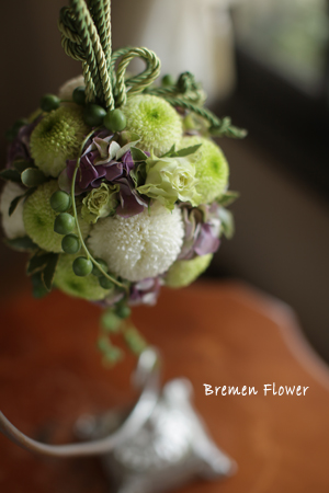 白いピンポンマムの和装用ボールブーケです。アクセントは、紫色のアジサイとグリーンネックレス。 色内掛けにも、白無垢にもどうぞ。