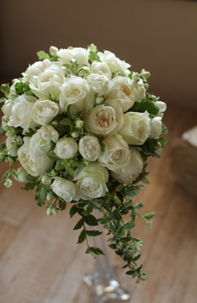 丸い白バラは、甘い香りが魅力の‘ピュールパルファン+’同じく丸い小さいバラを合わせて、ラウンド型に。グリーンを流して、ナチュラル感を出しました。ウェディングドレスにもカクテルドレスにもどうぞ。