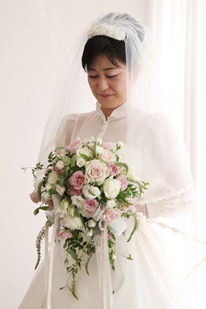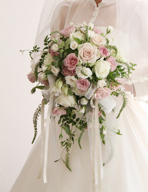 大人ピンクのバラ‘シュナーベル’が人気です。その‘シュナーベル’を使って、ナチュラルなブーケに仕上げました。ウェディングドレスにも、お色直し用のドレスにも、どうぞ。