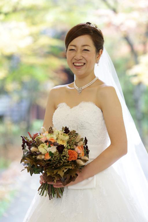 軽井沢高原教会での挙式に合わせ、自然にマッチするようなナチュラルなクラッチブーケをお作りしました。バラ「ヘリオスロマンティカ」やケイトウなどを使って。