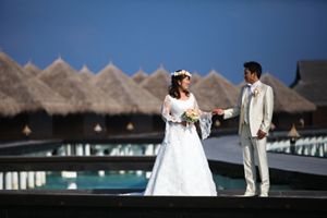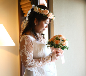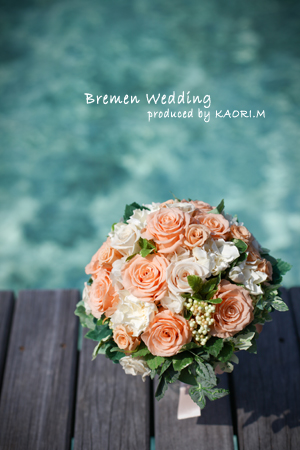 青い空と青い海に映える、明るいバニラピンクのバラを使ったラウンドブーケです。お揃いの花冠は、いかがですか。