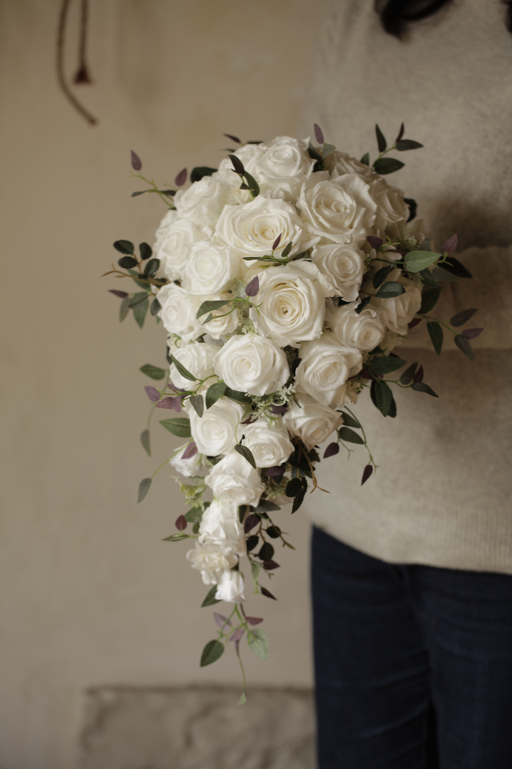 アイボリー色のバラとグリーンのみで長めのキャスケードブーケをお作りいたしました