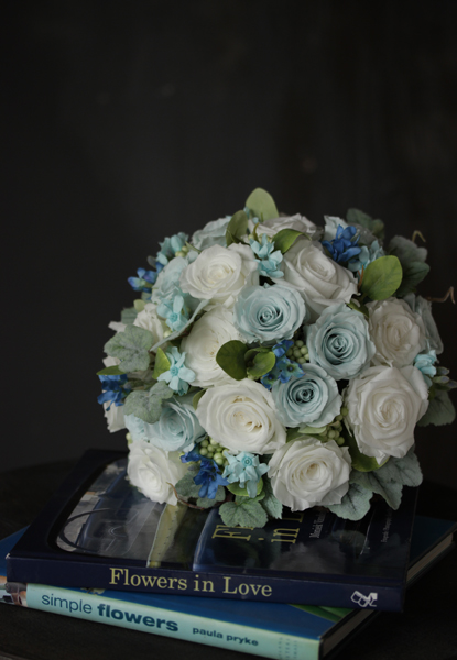 企業様への撮影用ブーケとしてブルーのラウンドブーケをご用意いたしました
