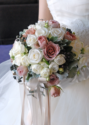 レースやチュール素材の柔らかいドレスにお持ちいただきたいブーケです