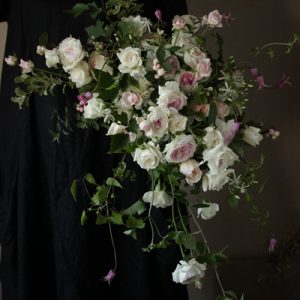 ロゼット咲きのバラをふんだんに使用してゴージャスブーケをお作りいたしました 花の中央が青みがかったピンクの白バラは“モノセロス”です ピンクに合わせてベル型のクレマチスをお入れしております & […]