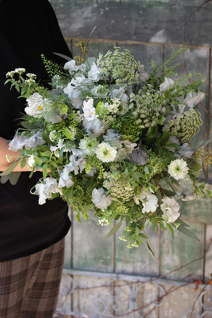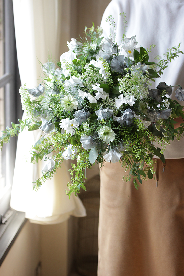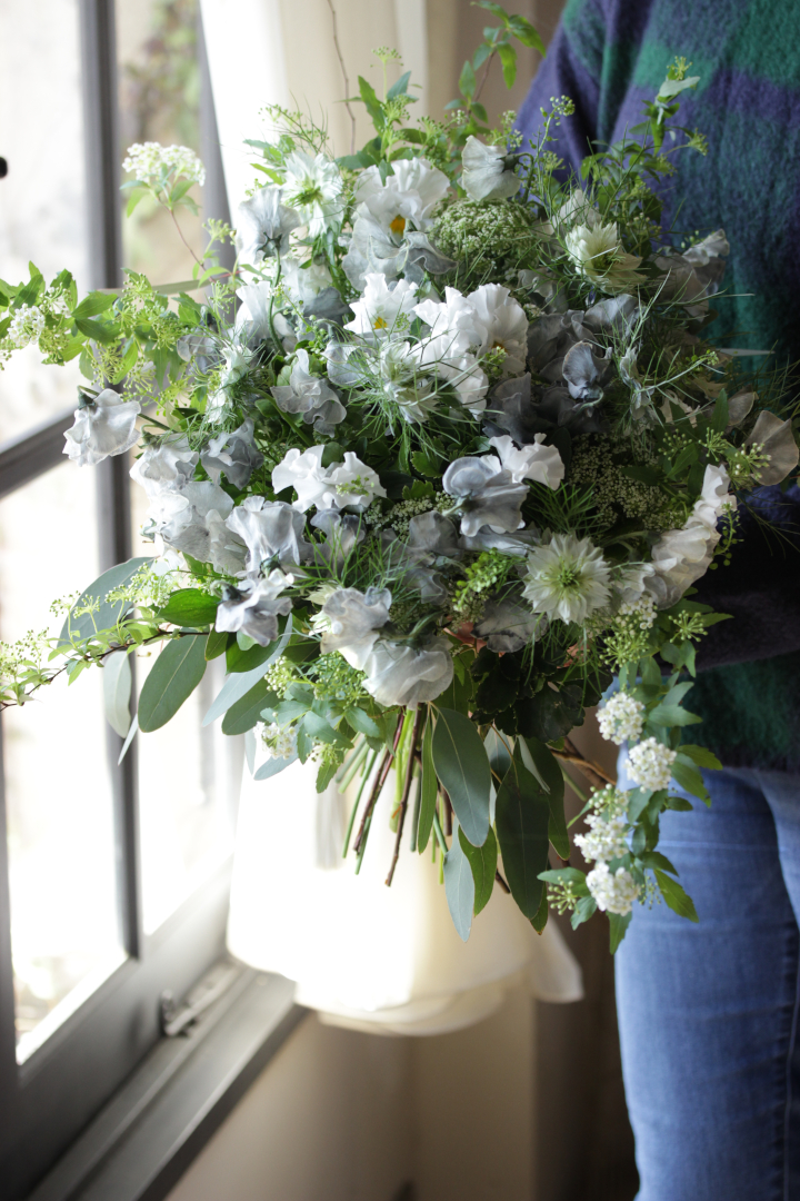 本日は白とアッシュブルーのお色で花束をお作りいたしました