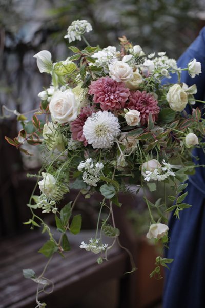 2種類のダリアとアンティーク色のバラを使用してデザインブーケをお作りいたしました