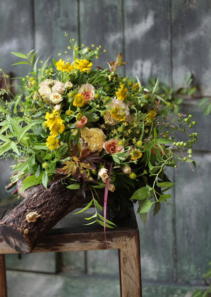 チョコレート色の葉物“ディアボロ” も添えて 秋色を加えたナチュラルブーケに仕上げました