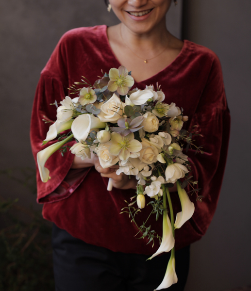 こちらのブーケはクリスマスローズをメイン花に制作したラウンドブーケです。