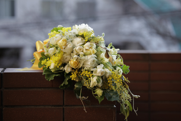 白いお花をベースにポイントでミモザをお入れして兼用ブーケとして持たれても良いですね。