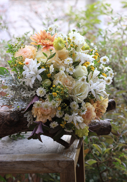 最近は ナチュラルブーケに長くリボンを付けるのが流行のようです。
