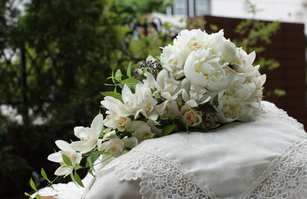 使用した花材は、芍薬【白妙】 バラ【トレミヨヌ】 シンビジウム 利休草です。