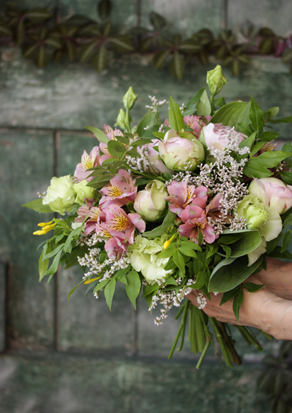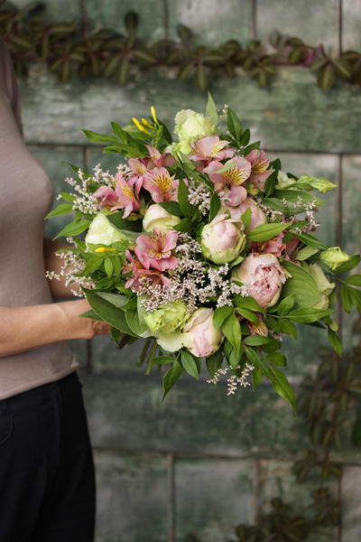 淡いピンクの芍薬とグリーンいっぱいのクラッチブーケをお作りいたしました