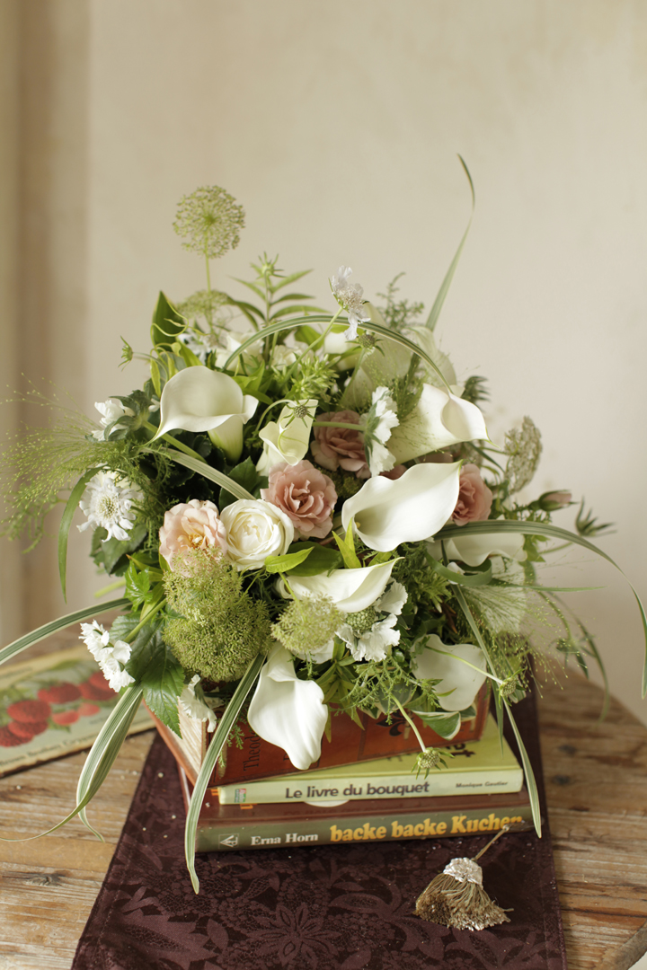 スカビオサ“アルバ”やスモークグラスなど草花系をお入れしてナチュラルに仕上げました