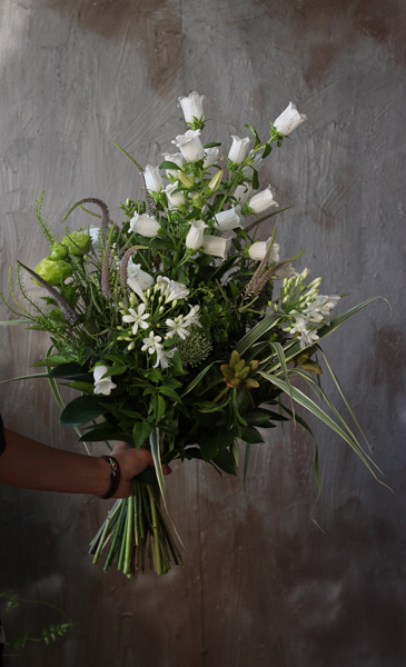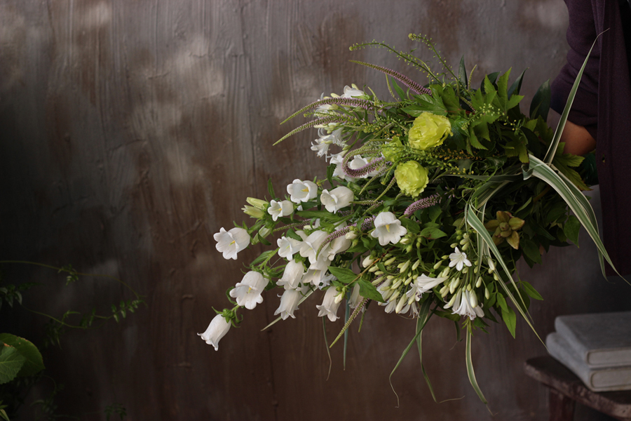 トップの白いお花はカンパニュラです。英名がベルフラワーと名のとおり鈴の形をした