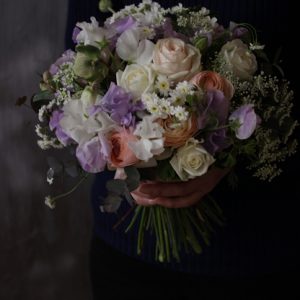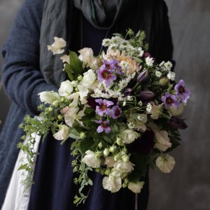 花束の中央にお入れしたチューリップは“ブラックチャーム”です 深い紫色の花弁が魅力的なブラックチャームと組み合わせたお花は アネモネ リューココリーネ スイートピー マトリカリア スプレーバラです 小花を多 […]