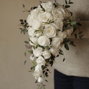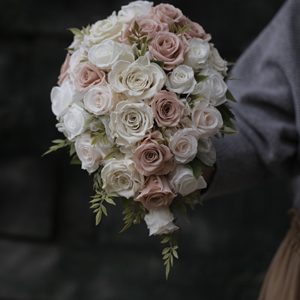 アイボリー色のバラとグリーンのみで長めのキャスケードブーケをお作りいたしました グリーンは複色をお入れしております 1月の挙式を予定されている花嫁様のブーケです 花嫁様のご確認が無事済みましたら 仕上げへと […]