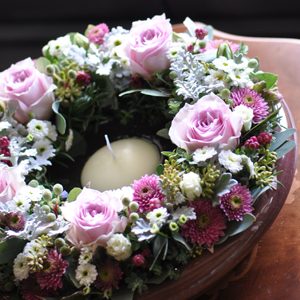 秋の花 小菊で飾ったリースアレンジメント 中央にフローティングキャンドルを浮かせれば キャンドルサービスにぴったりの 卓上花になりますね!   […]