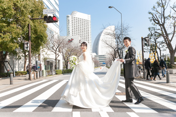 Read More横浜ロイヤルパークでの挙式 式場へ向かうお二人は まるでビートルズのよう! 幸せそうな笑顔が微笑ましいです! いつまでもお幸せに!!