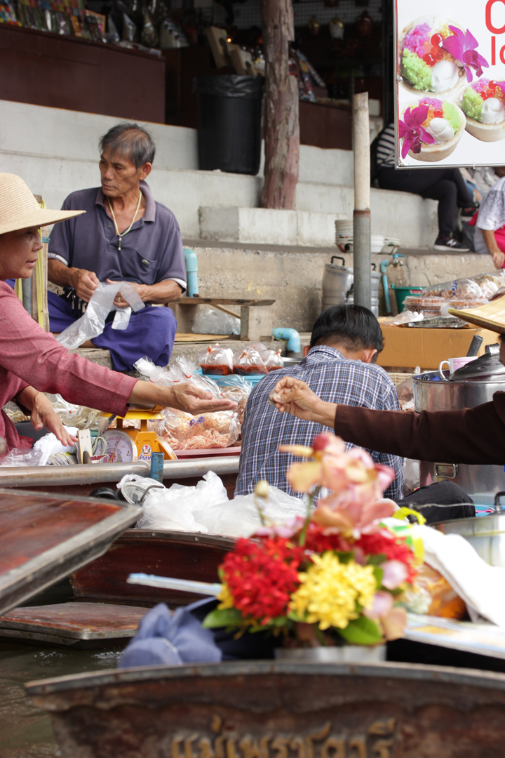 小舟の上で焼き鳥のようなものも焼いたりして、市場中が美味しそうな香りに包まれていました。