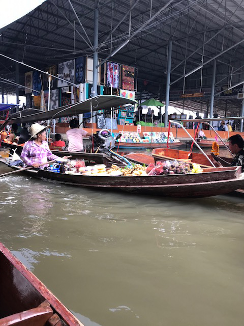 小舟に沢山のフルーツや木彫りの置物やタイシルクなど、色々なものが