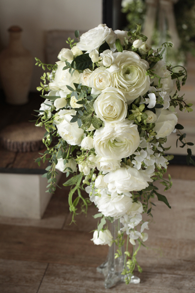 挙式用のブーケにお選びいただいたのは大輪ラナンキュラスとバラのキャスケードです。