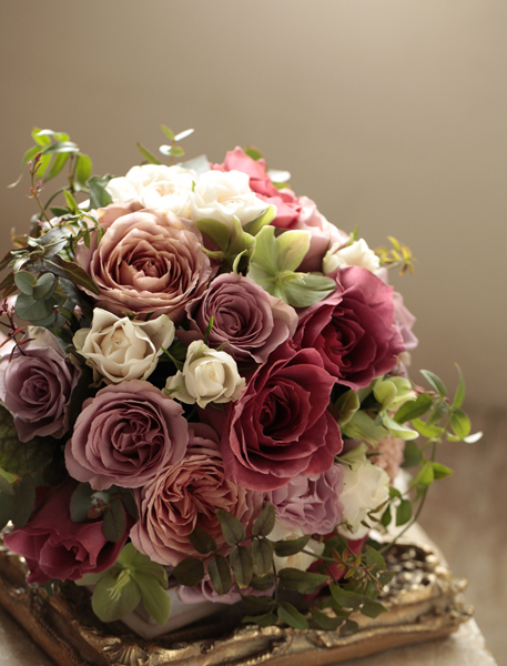 カクテルドレス用のブーケにお選びいただいたのはアンティークカラーのラウンドブーケです。