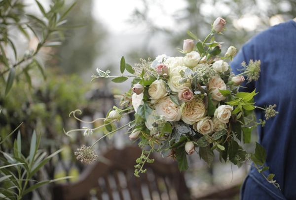 バラ“グランオマージュ”をメイン花にストックやスカビオサを組み合わせております