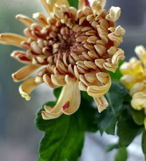 マムヨーロッパで近年、品種改良されたココア色の大輪菊。バラなどの洋花と組み合わせると個性的でオーセンティックな雰囲気を作ります。