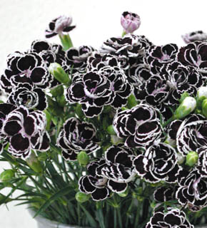 カーネーション黒に白いふちどりの小輪カーネーション。アイボリーやシュガーピンクと合わせると意外な可愛らしさがでます。