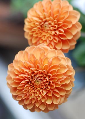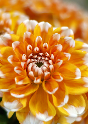 オレンジのグラデーションが印象的な中輪ダリア。色、形ともに主役級の華やかさ。和装にもよく似合います。