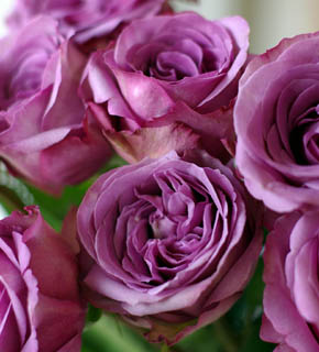 幾重にも巻いた花びら、やや青みがかった紫色が特徴的な大輪バラ。シルバーブルーの葉物と組合わせると落ち着きのあるブーケになります。