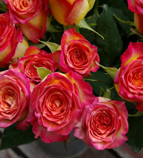 黄色・オレンジ・赤のグラーデーションを持つ大輪バラ。落ち着いたオレンジや赤と組み合わせると華やかさが引き立ちます。メインのお花向き。