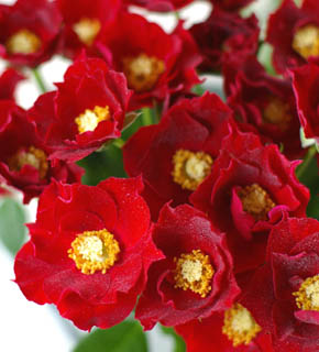 真っ赤な花びらと黄色の花芯とのコントラストが色鮮やか。小さいながらも密集して咲くスプレータイプなので、華やかさもきわだちます。最高の脇役になるバラです。