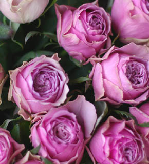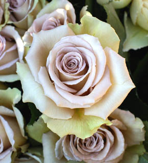 中心は、うすい藤色、外側はうっすらと緑がかった、ミステリアスな色のバラです。シックな中間色なので、ポイントになる色の濃いお花と合わせます。非常に素敵なバラです。