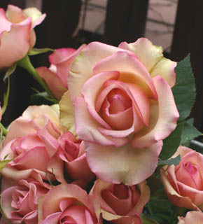 上品なピンク色のふちどりのある、大輪のバラです。ブーケなどの主役にしたいお花です。濃い目のお花と合わせても、アイボリー系で合わせてもいいでしょう。