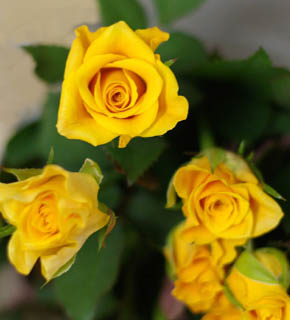 山吹色の小ぶりのバラ。レモンイエローに比べ、やや落ち着きのある色目なので、シックな葉ものとまとめるのもいいでしょう。