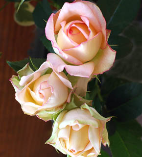 きれいなクリーム色に、ピンク色のふちどりのある大輪バラです。スタンダードな花形でバラらしいバラと言えるでしょう。ピンク系にもオレンジ系にも仕立てられます。