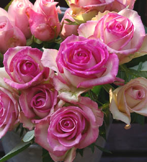 ガリカローズのひとつで、オールドローズの中でも、もっとも古い系譜を持つバラです。花びらの外側は白、中はピンク、ぽってりとした大輪。エレガントでロマンティックなブーケをご希望の方におすすめしたいバラ。