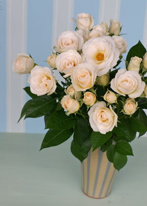 カントリーガールとよく似ていますが、花びらの色が微妙に違っています。丸くころりと咲く、中輪タイプのスプレーバラで人気のある色合いです。