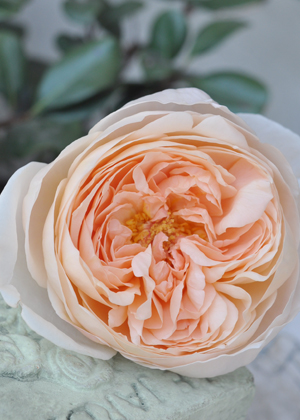 アプリコット色のイングリッシュローズです。 存在感のあるロゼット咲きのエレガントな バラです。やさしい色合いがウェディングに ぴったりです。