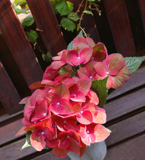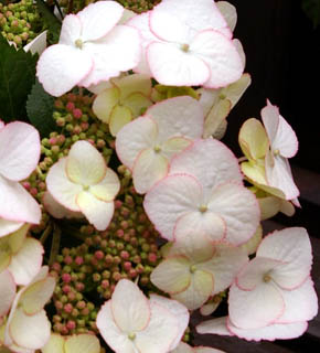 あじさい新種の額あじさい‘アルテミス’。オフホワイトにほんのりグリーンがかっていて、ガクの縁は、赤。ピンクや赤いお花の添えとして使いましょう。