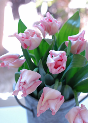 チューリップ花弁の中が強くくびれ、先端が反り返っているのが特徴的。花は小さめですが、波打ちが多くボリューム感があります。淡いピンクが可愛らしい印象に・・・