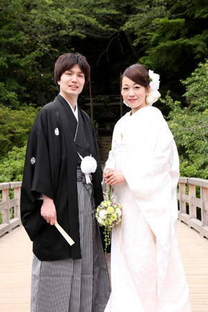 2種類のピンポンマムとグリーンのバラで構成された和装用のボールブーケ。手まりのような形が人気です。紫色のアジサイとグリーンネックレスがアクセントになっています。