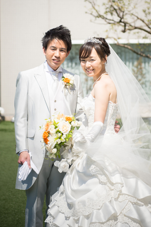 白いダリア‘シベリア’でお作りした洋装用のラウンドブーケです。挿し色はオレンジ色の濃淡。明るいグリーンを合わせて、軽やかに。