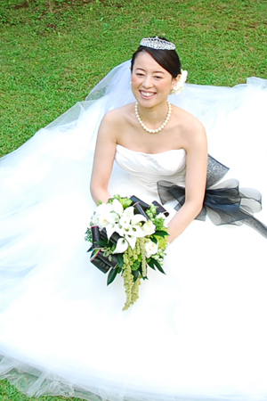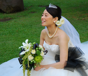 カラー‘クリスタルブラッシュ’を使ったクラッチブーケです。個性的なドレスに合わせて黒いリーフを入れました。
