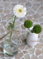 白いガーベラ3種とグリーンのガーベラを絶妙に組み合わせた、ガーベラのキャスケードブーケ。可愛くなりがちガーベラのブーケを上品にエレガントに仕立てた逸品です。白い八重咲きガーベラ‘ユトリロ’とグリーンのユニークなガーベラ‘マリモ’を使用しています。