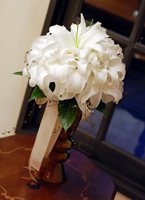 ‘カサブランカ’という白いユリをメリアブーケに仕立てました。独特のフォルムは、豪華そのもの。挙式用ブーケにぴったりです。グリーンのあしらい方でモダンにも、エレガントにもアレンジができます。