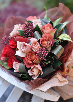 チョコレートや紅茶色を連想させるシックな、でも華のある花束です。こだわりのお母さまへの贈呈用にいかがでしょうか?